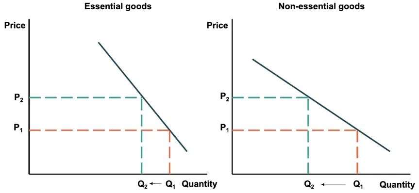 必需品与非必需品弹性比较,价格同等涨幅导致了非必需品需求量更大幅度的下降(来源:conjointly)