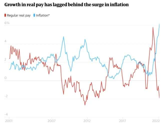 实际工资增长滞后于通货膨胀,消费物价指数包括住宿成本(来源:ONS,The Guardian)