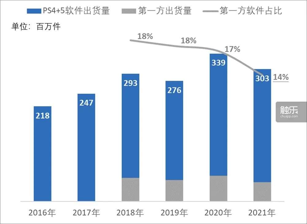 玩家的活跃情况与软件的销售情况相互影响。索尼的2020财年,软件销量受益于PS5上市创出新高,但是在2021年并没能持续。原因也许是前述用户活跃情况不佳,也许是这一年来游戏阵容一言难尽——2021年索尼第一方游戏出货量占比毫不意外地降至14%的低点。好在PS平台的月活用户与当年新售软件的比率基本维持在3左右,显示了PS用户对软件的购买意愿总体稳定。
