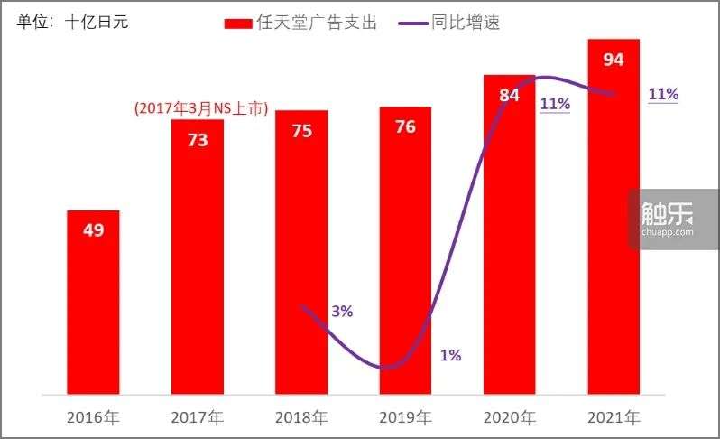 在近两个财年中,“扩大用户数量”的具体行动表现在了不断增长的广告开支上。任天堂曾在2017年大幅增加广告支出,达到720亿日元,此后连续3年广告支出都大致持平。但从2020年开始,广告支出已经连续两年增长11%。