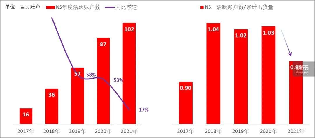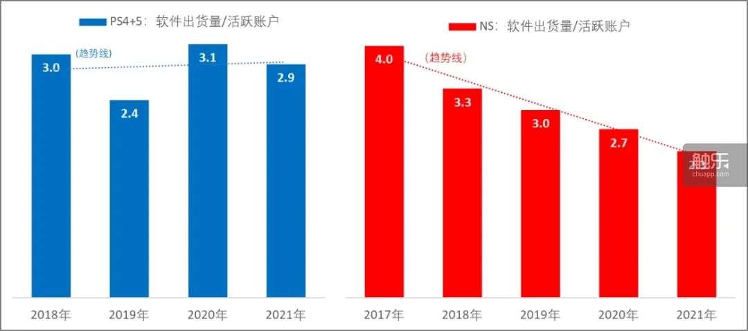 反观NS,好消息是随着装机量提升,活跃账户数量创出新高,但活跃账户数与累计出货量的比率开始下降。这意味着更大比例的用户开始闲置主机。