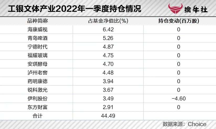 持仓也表现出了现阶段她对投资的思考。从2021年一季度开始,工银文体产业的前十大持仓股变动就逐渐减少,截至2021年末大多集中在消费与科技,且在2022年初前十大持仓中有9只持仓没有变化。