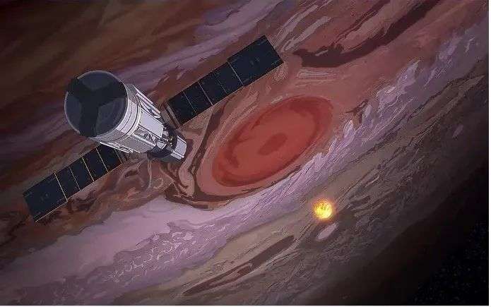 木卫一闪烁,背景中木星的大红斑清晰可见