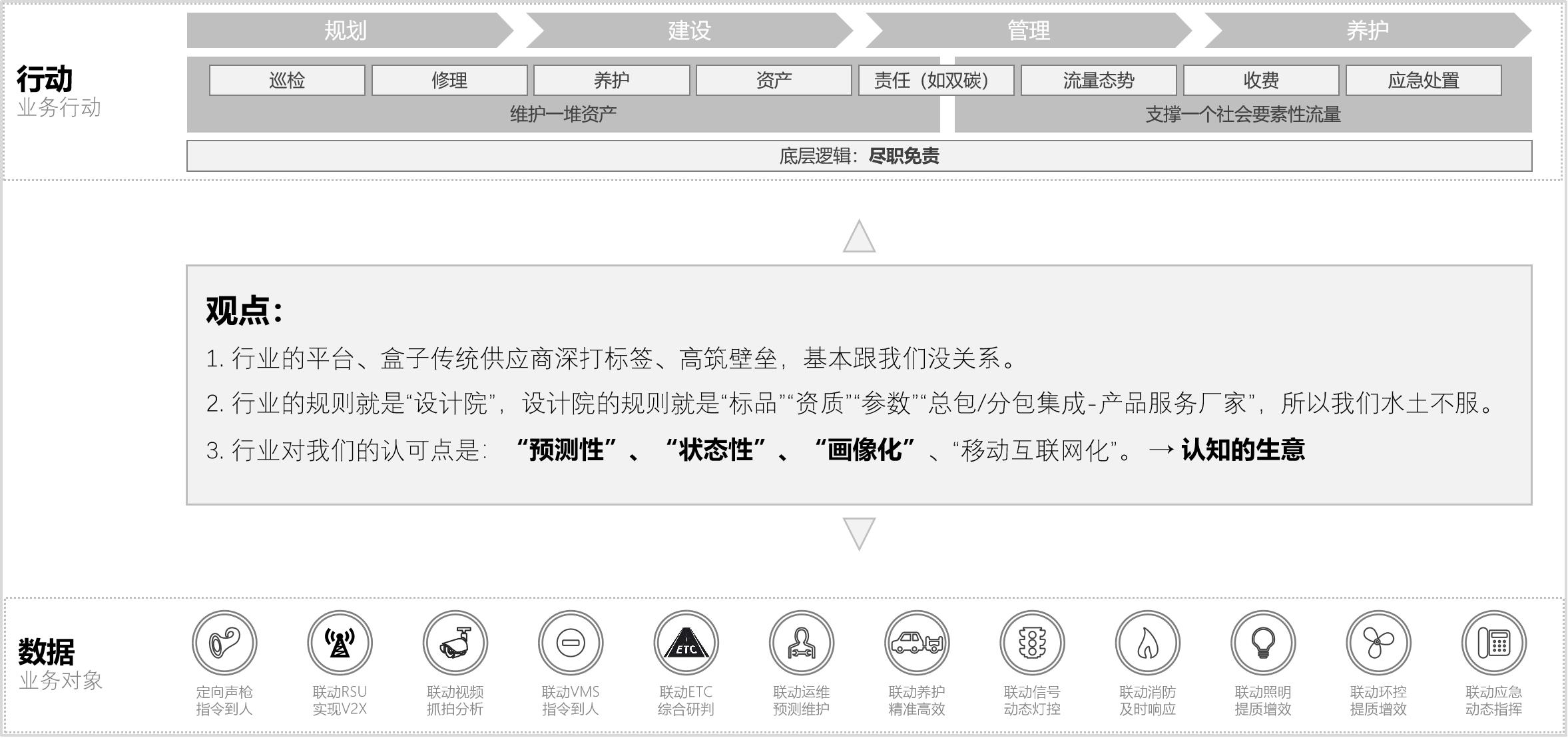 从业务实际行动出发,张磊将其总结为“规划-建设-管理-养护”四个阶段,从而延伸出来两个基本业务职能——巡检、修理、养护等维护职能,与应急处理、态势判断、收费社会责任等支撑职能,以此完成对社会要素性流量的掌控。