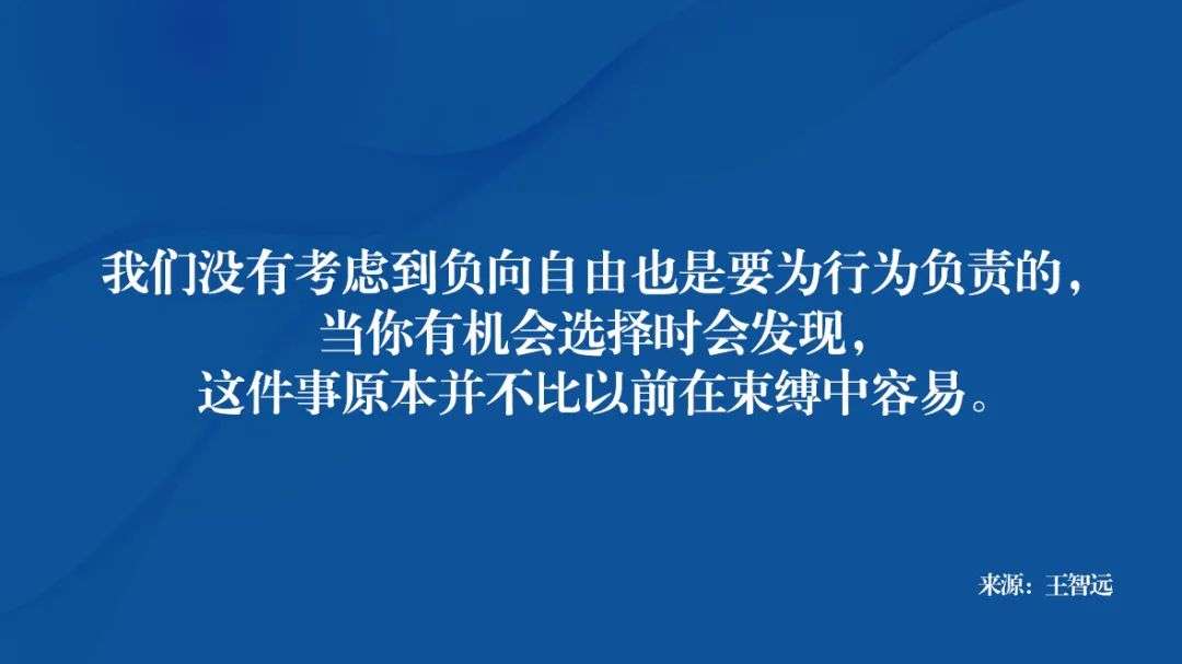 这当中主要原因在于,我们没有考虑到负向自由也是要为行为负责的,当你有机会选择时会发现,这件事原本并不比以前在束缚中容易。