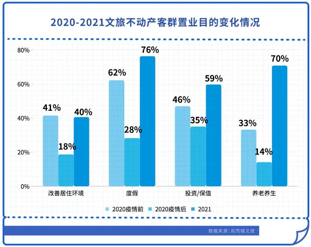 在疫情形势稳定后,2021年文旅地产客群置业的核心目的由疫情前的“投资/保值”转变为“度假”。此外,养老养生需求明显上升,成为排名第二的核心置业目的。