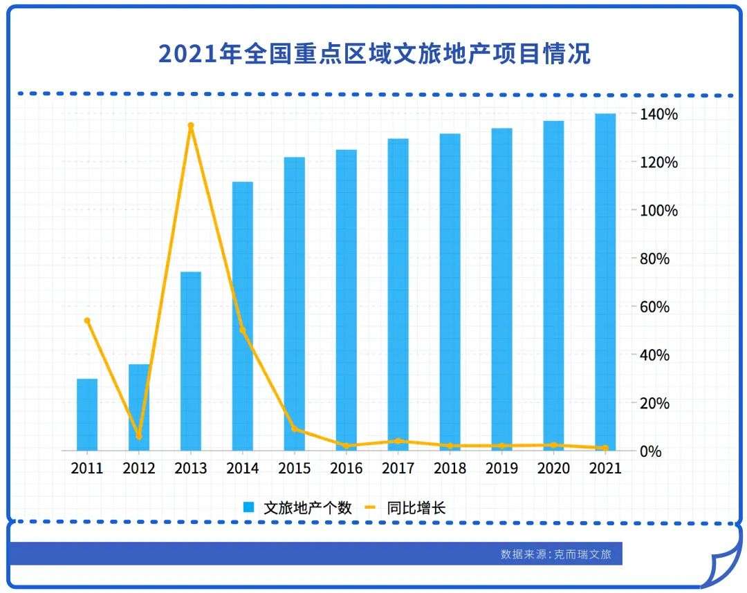 2021年,全国重点区域文旅地产项目共有9987个,同比增长1.1%,自2018年以来,文旅地产项目增速常年保持在2%左右。