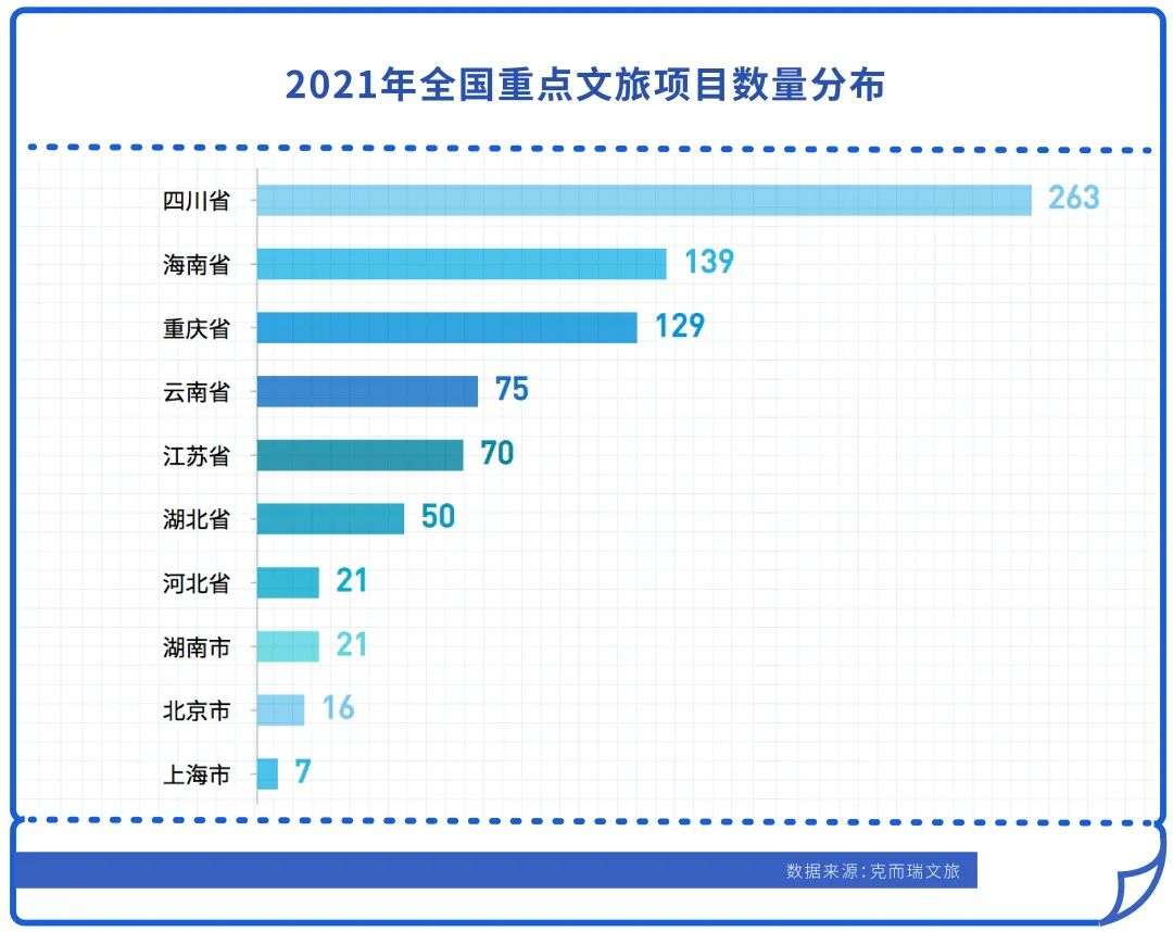 全国重点文旅项目主要分布在四川和重庆,川渝已成投资高地,数据显示,2021年川渝文旅项目合计达到392个。其中,四川省文旅项目共263个,是排在第二位海南省的1.9倍。