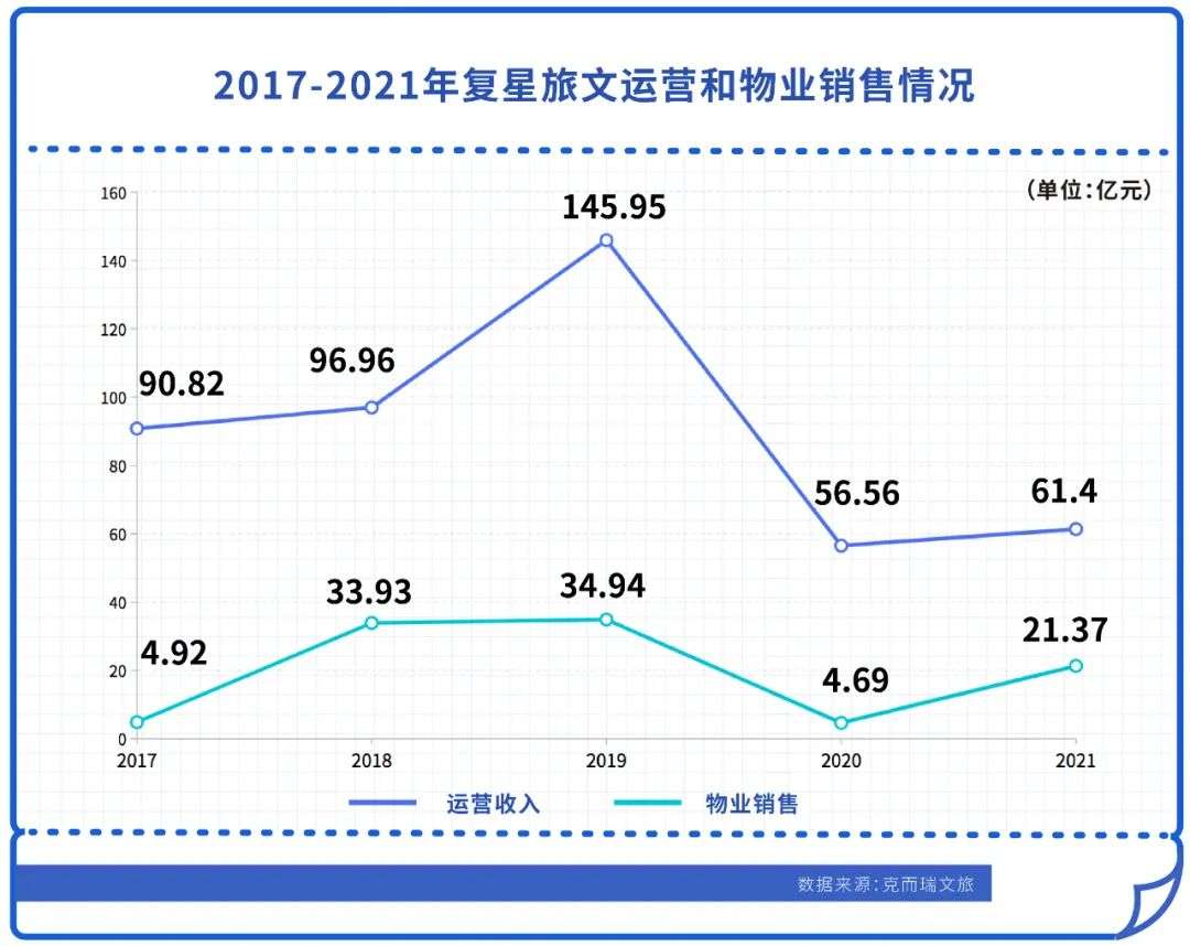2021年,复星旅文实现营收92.61亿元,较2020年增长31%,其中运营收入达到61.4亿元,占总营收超六成。