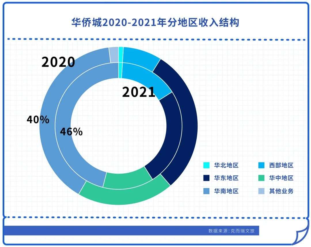 从华侨城分地区收入结构来看,2021年,华南区域贡献了46%的收入,较2020年时增加6个百分点。
