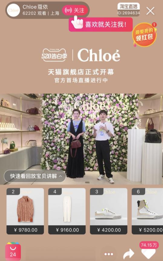 后续入局的奢侈品品牌吸取了前者的经验教训,在直播间的安排与直播风格上更加贴近奢侈品的调性。Chloé在去年5月20日进行了自己的首场带货直播,在这个特殊的日子将品牌的浪漫属性与直播结合,不仅设置了花墙,还将单品与年轻用户关注的星座关联到一起,呈现了一场相对成熟的带货直播。这场直播吸引了6.2w人观看,数据在奢侈品牌的直播中名列前茅,但与头部主播相比,差距依然明显。