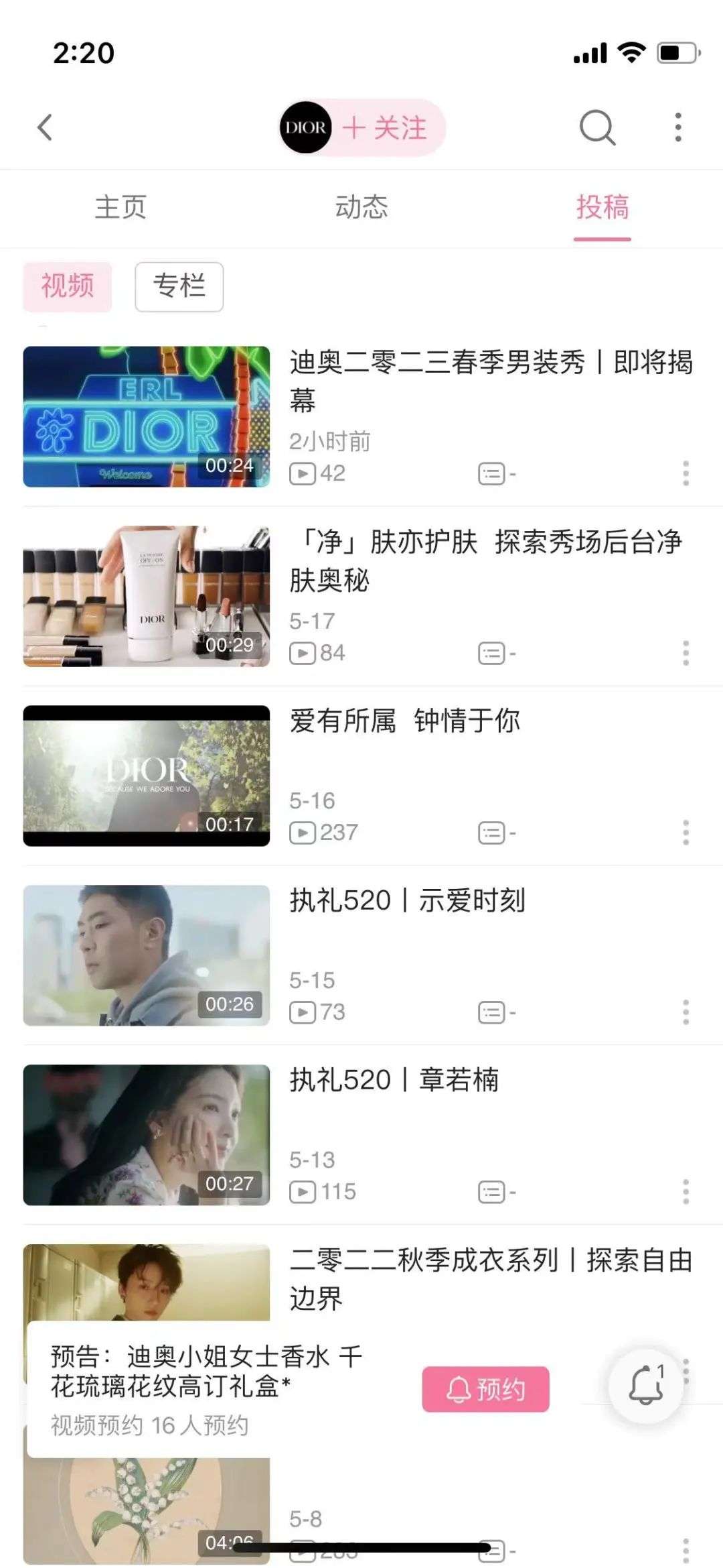 Dior算是线上营销走得相对激进的奢侈品品牌,早在2020年Dior就开通了自己的B站官方账号,但两年的时间累计粉丝量还不足3万,近期的视频平均播放量也只有100左右,可以用“惨淡”来形容。