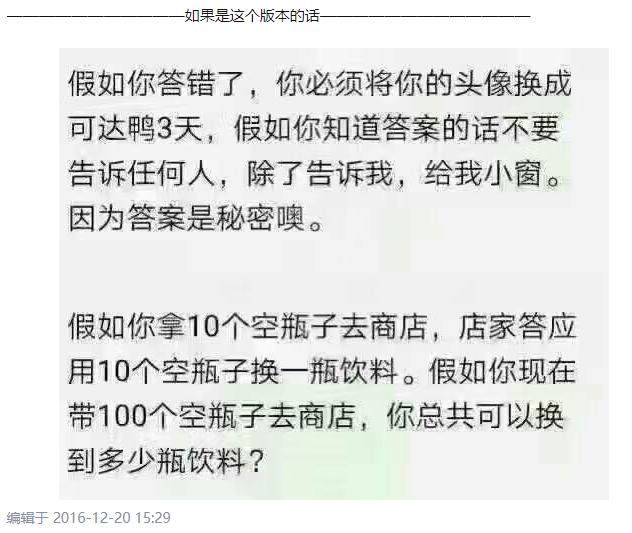 正因如此,可达鸭出圈的时间并不少。在2016年的时候,可达鸭就曾因为一道智力题出圈:“用10瓶空的可乐瓶可以换取一瓶可乐。现有100个空可乐瓶,问能换几瓶可乐?” 这个被称为“可达鸭问题”的智力测试有着特殊的规矩:回答错误的话,头像要换成可达鸭并维持3天;而且不可以把答案告诉任何人。