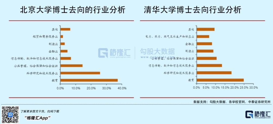 从清华、北大的博士去向来看,除了教育和科研这两大主流选择外,工作稳定的公共管理部门,以及收入较高的信息软件和金融行业也是他们的重要择业方向。2018年,进入教育和科研行业的清华和北大博士分别在40%、60%左右。