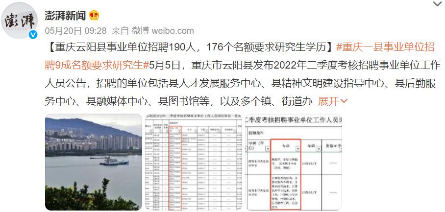 近日,重庆云阳县冲上了热搜,原因是当地事业编招聘9成以上都要研究生,招聘的都是县人才发展服务中心、县融媒体中心、县文化馆、县畜牧发展中心、街道办事处等基层岗位。