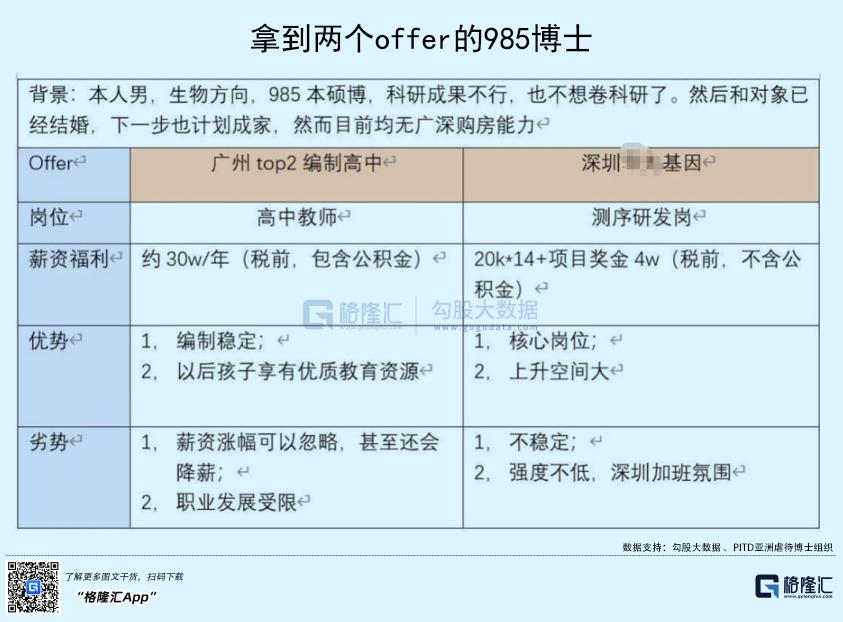 其实,他们也是有血有肉的人,也面对着高房价、结婚生子等诸多俗世的烦恼,他们这么努力也只是想让自己和家人生活得更好一点。正如那位在广州高中编制和名企技术岗之间纠结的博士一样,他也会考虑成家和购房问题,感慨自己目前没有广深购房能力。