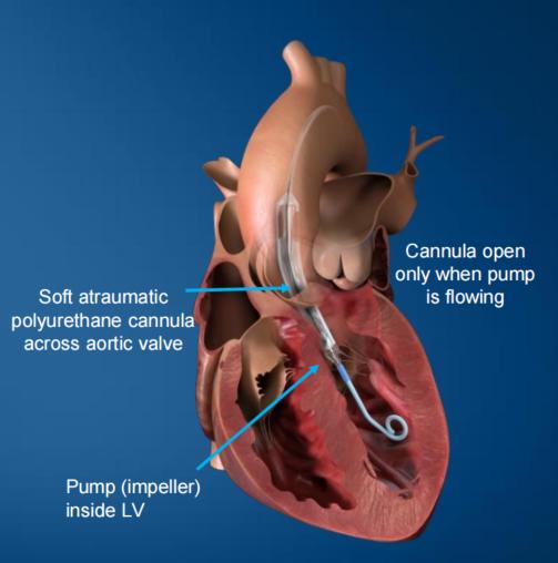 作为全世界最小的人工心脏,Impella ECP所使用的护套和泵仅9 Fr(约3 mm),在降主动脉中卸下护套,心脏泵(叶轮)可扩展到约18 Fr,手术完成后,心脏泵缩小并重新套回至9 Fr护套,其峰值流量大于每分钟3.5 L。