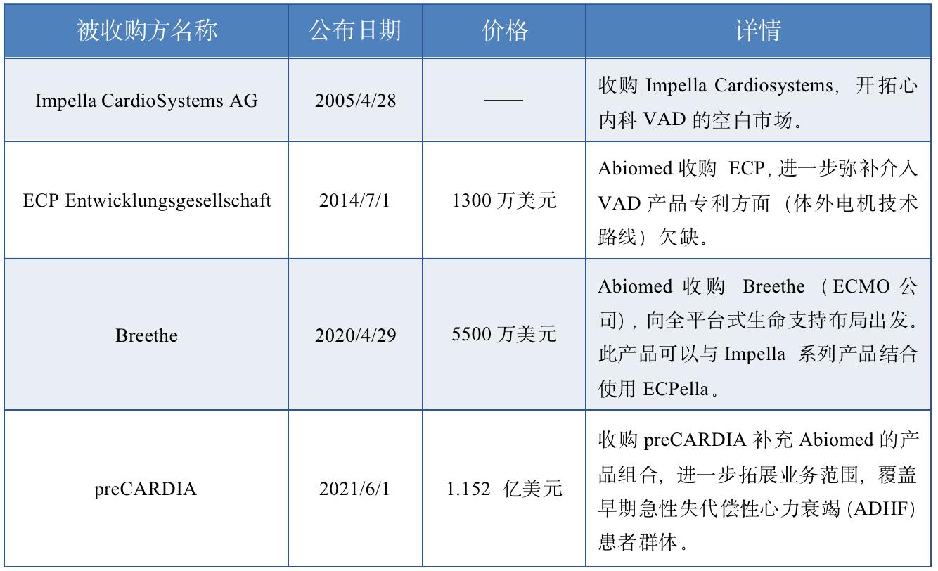 2005年,Abiomed收购德国亚琛的心室辅助设备公司Impella CardioSystemsAG,此后公司的发展重心便逐渐转向心肺康复领域,并不断在介入泵小型化的技术创新与急症生命支持进行全场景布局,布局了Impella系列产品。