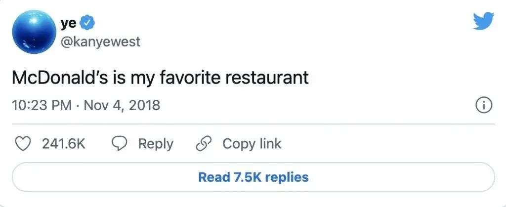更早之前,还没改名为 Ye 的 Kanye West 就已经直接表达过自己对麦当劳的喜爱。比如 2018 年在推特的发言:「麦当劳是我最喜欢的餐厅」。