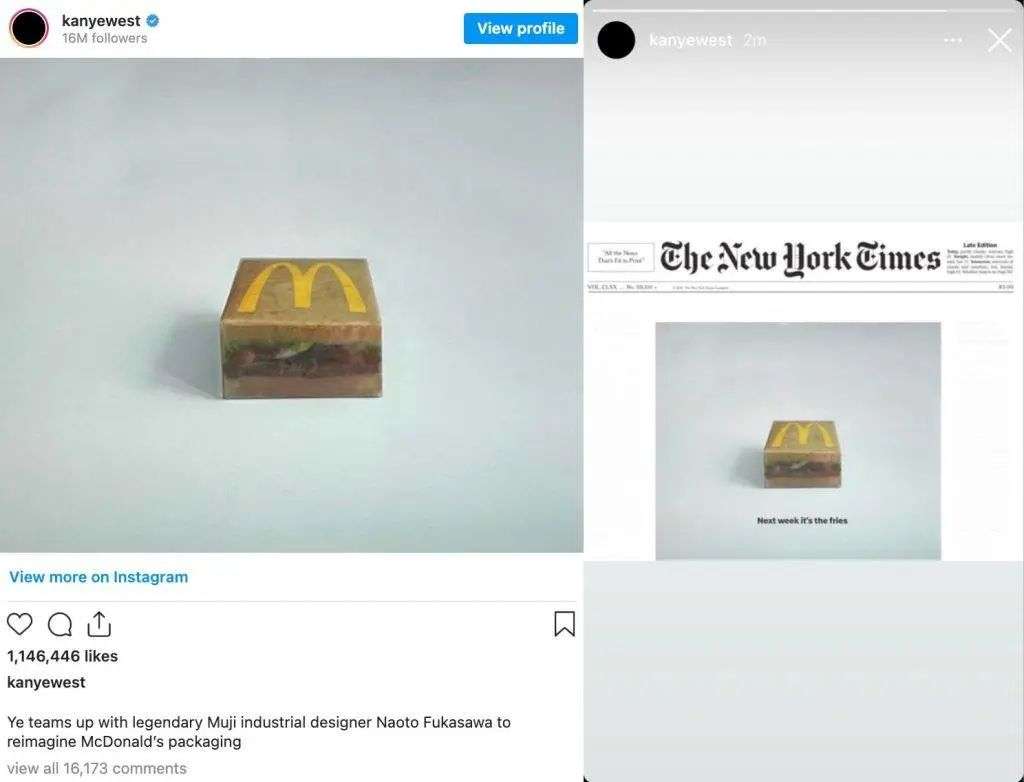 就在不久前,Ye(Kanye West ,坎耶·维斯特)在自己的 Instagram 上发布了一张照片,并写到他将与设计师 Naoto Fukasawa (深泽直人,无印良品设计师)合作,重新构想麦当劳的包装。