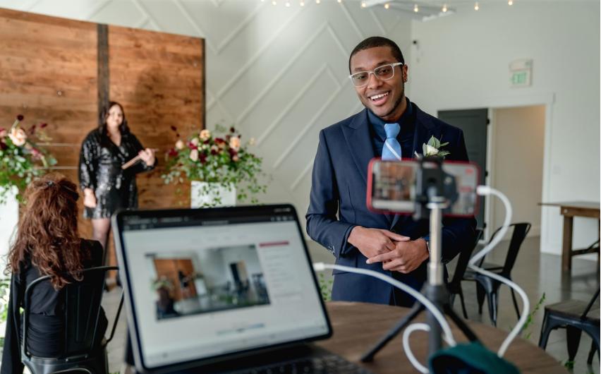 操作方式十分便捷,用户只需要下载lovecast软件,创建活动获取直播链接即可邀请朋友们线上参与婚礼直播。还可以自定义,例如添加个性化音乐、ppt、相片和留言簿等。参加婚礼的宾客并不需要下载app,在网页端也可以完成浏览,而且没有国籍限制,目前已经见证了全球超过1万对新人的婚礼直播现场。