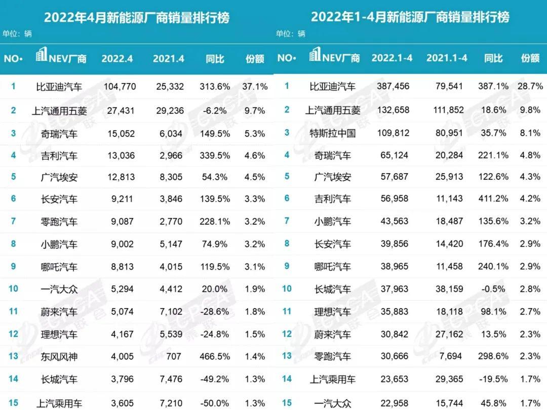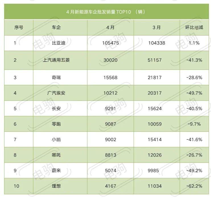 4月新能源乘用车厂商批发销量突破万辆的从此前的近10家跌至4家。比亚迪再次蝉联新能源汽车销冠;而南北大众因受到长春与上海的疫情影响表现艰难;零跑、小鹏、哪吒、蔚来、理想等造车新势力均表现不佳,尤其处于第一阵营的“蔚小理”的环比降幅较大,皆超40%。