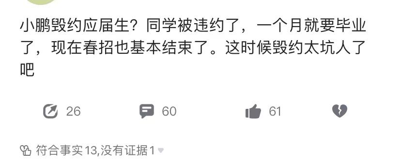 有用户在脉脉爆料称,小鹏开始毁约22年未入职校招生,并劝大家“能跑的赶紧跑吧”。在该话题下,不少网友爆自己被裁经历,并表示“小鹏太坑了”“这公司真的毫无诚信”。“小鹏汽车被曝毁约20余名应届生”登上微博热搜2位。