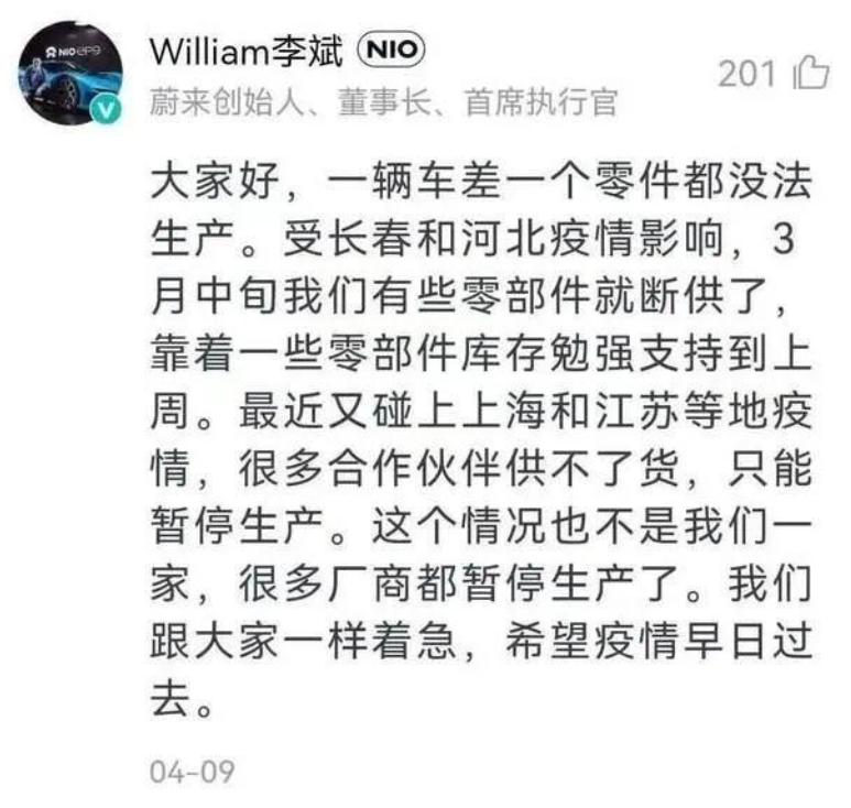 “一辆车差一个零件都没法生产。这个情况也不是我们一家,很多厂商都暂停生产了。”李斌在蔚来汽车APP中表示,受疫情影响,3月中旬蔚来已有零部件断供,靠着库存支持到上周,近期上海、江苏等地的疫情导致更多合作伙伴无法供货,只能暂停生产。