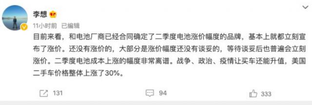 理想汽车CEO李想也曾在在社交媒体发文称二季度电池成本上涨的幅度非常离谱,并调侃“买车还能升值”。