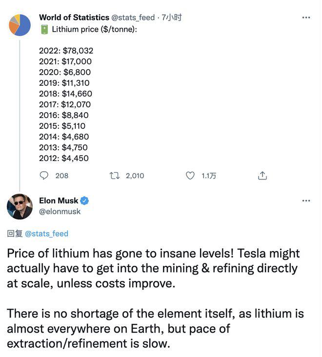 4月,特斯拉总裁马斯克发推文展示了动力电池主要原材料之一的碳酸锂过去十年的价格变化,并表示锂价格已经达到了“疯狂水平”,如果价格仍得不到缓解,特斯拉可能大规模进军采矿和冶炼行业。