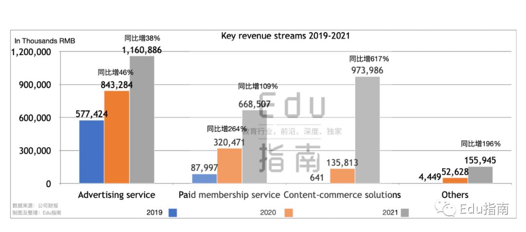 知乎公司营收主要来自五项业务,包括广告、付费会员、内容商务解决方案、职业培训、其他。