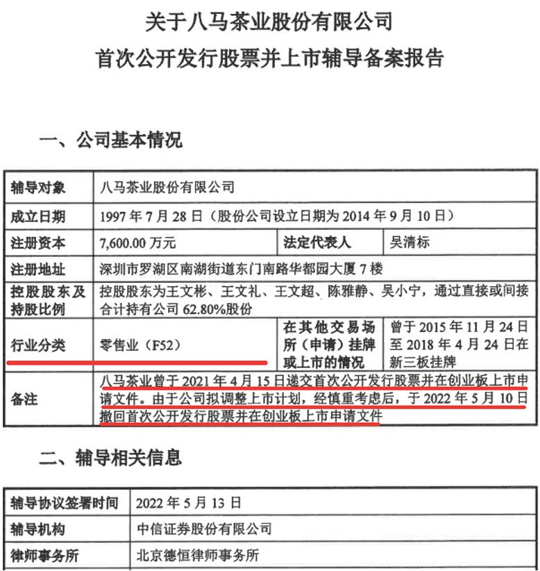 作为我国最大的铁观音生产商和销售商之一,八马茶业曾于2015年12月以“铁观音第一股”的名号挂牌“新三板”;2018年4月宣布摘牌,官方给出的原因是“长期战略规划调整的需要”。时隔一年后,八马茶业与中金公司签署A股上市辅导协议,并于2019年7月24日在深圳证监局进行了辅导备案,但在发布了两期辅导进展报告后,中金公司于2020年9月3日向中国证监会深圳监管局提交了关于终止对八马茶业辅导工作的报告。随后,中信证券接手,并于2021年3月完成上市辅导工作,4月递交招股书。
