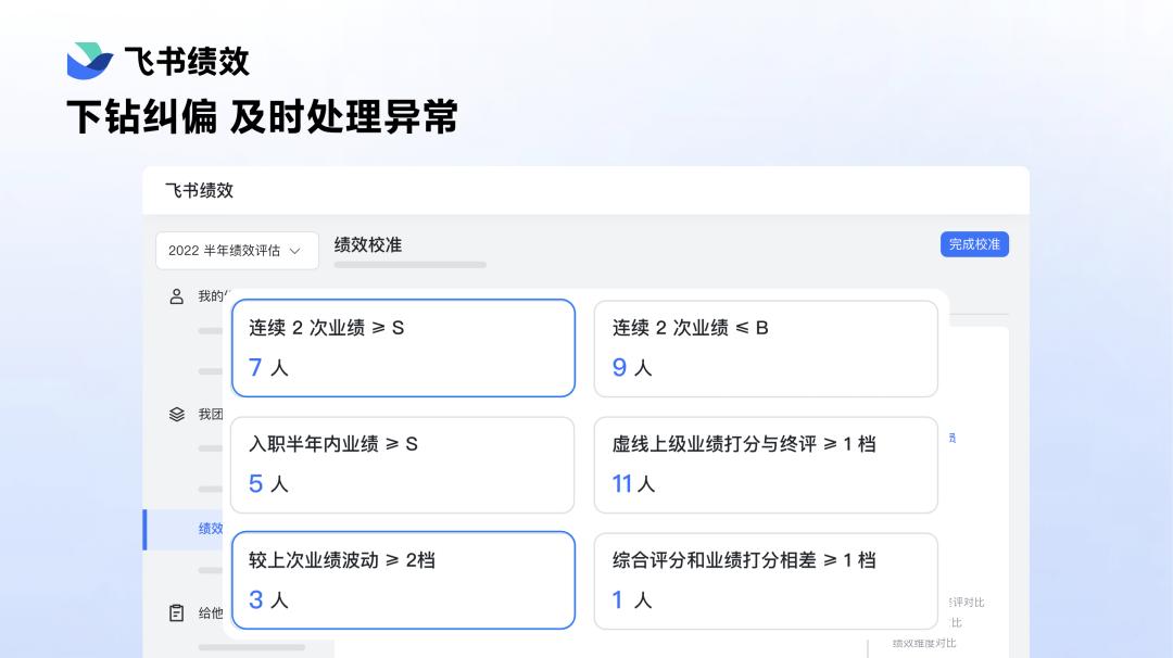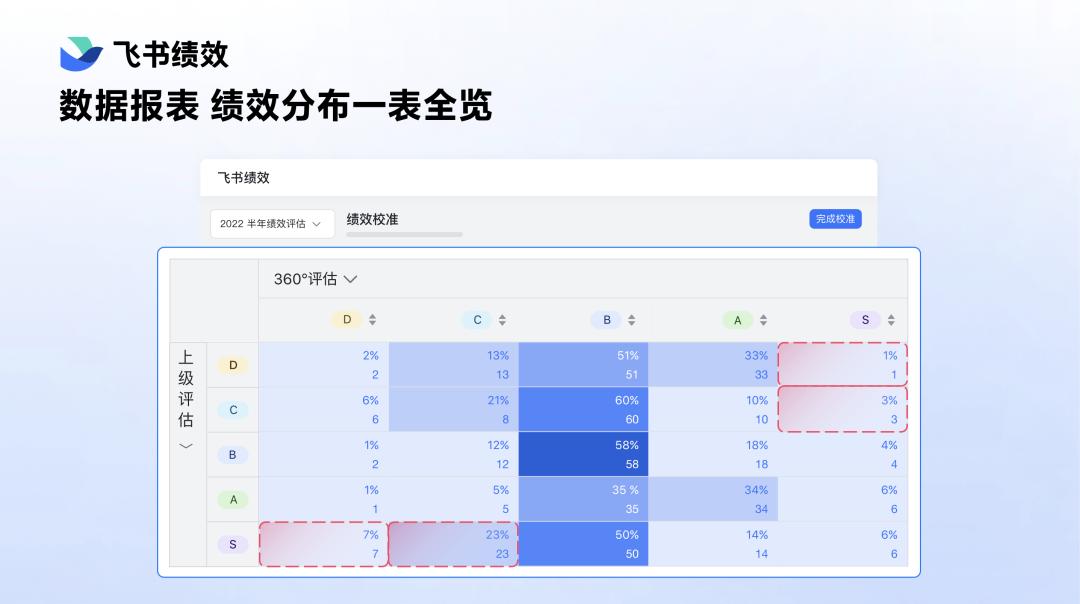 这就是绩效校准。各位看到的只是一张表,但其实有十几张二十张这样子的报表,你能看到整个团队的情况,你能按不同的维度把成员分门别类地放在一起,从一线经理层层校准一直到公司 CEO,从上到下一把尺打分。这就是飞书绩效,信息全面,决策客观。