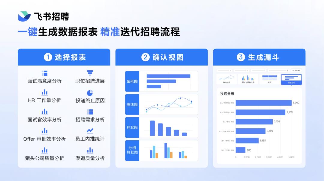 现在我们用飞书招聘,就可以一键搞定了。而且维度全面、口径统一,用人经理和 HR 可以一起通过漏斗定位招聘每个环节的问题,快速迭代招聘流程。