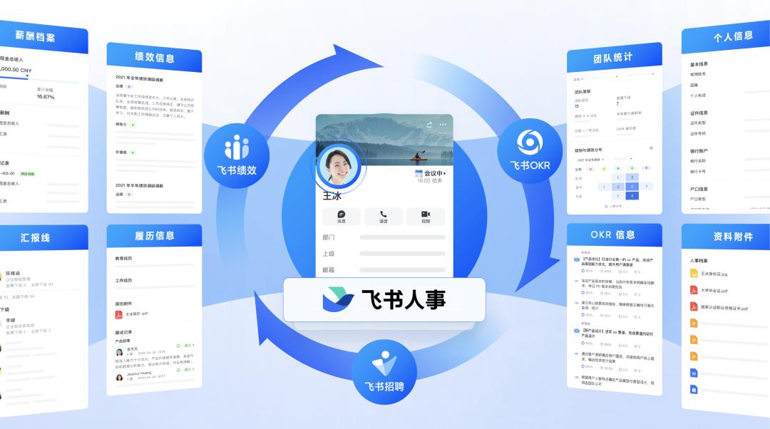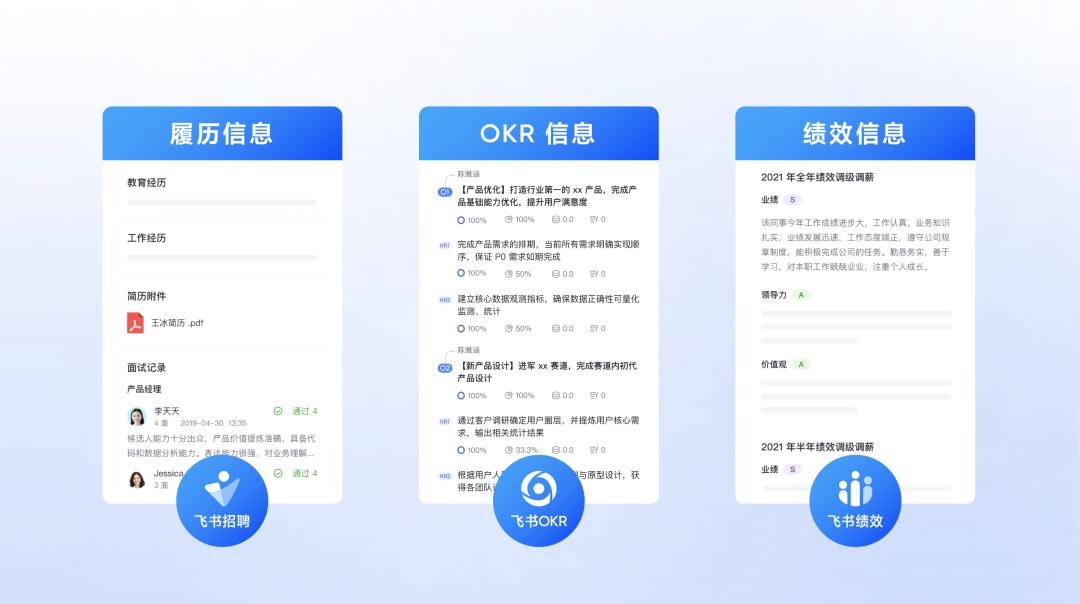 而飞书 People 打通了人才的所有数据——来自飞书招聘的履历信息和面试评价、来自飞书绩效的每一轮绩效信息,还有来自飞书OKR 的每一个目标和关键结果的进展,都流向了飞书人事。