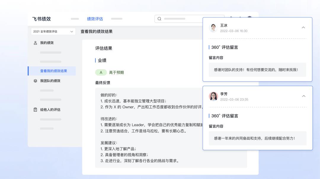 最后我们说回员工,这是一名员工在绩效季结束的时候在飞书里收到的绩效评估结果,上面展示着他的评分,上级给他的建议,以及协作方给他的留言。