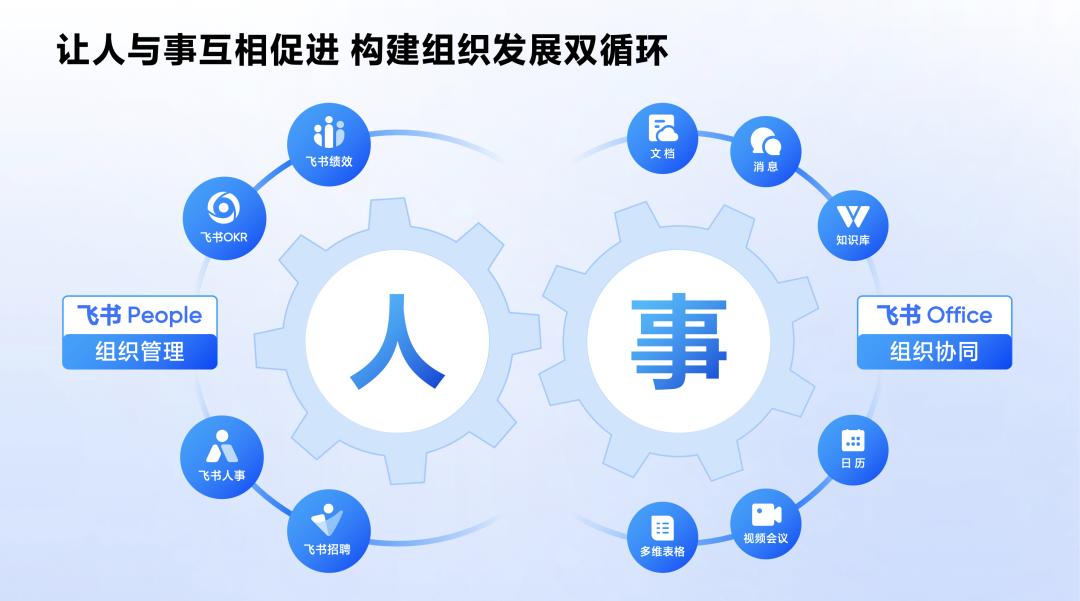 飞书 People 也将与飞书 Office 打通,实现“人事合一”。在管理中互相促进,共同构建成为组织发展的双循环。