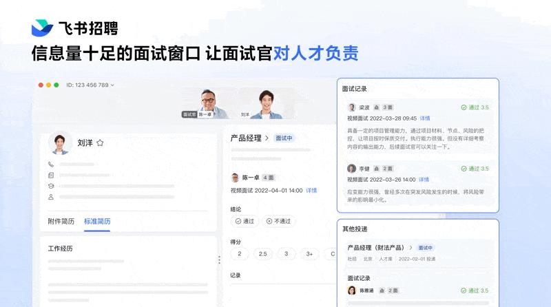 通过这一张一张的表,HR 才能跟业务打出围绕人才更漂亮的配合。同时,飞书招聘还有办法让日理万机的业务更主动地参与进人事中。以前面试官一句“我在出差”就让招聘的进度遥遥无期。现在,飞书招聘和飞书视频会议能够无缝打通,不管你是在居家办公还是刚刚下飞机,都可以马上开启线上面试。字节跳动现在 90% 的面试都是线上进行的。
