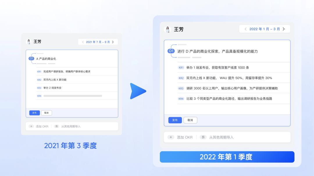 我们能清楚地看到她的变化,从一开始不顾优先级地罗列任务,到慢慢用自己的视角拆解战略,思考怎么能够有主有次地实现目标,甚至自己主动发起一个目标,自下而上地推动业务创新。