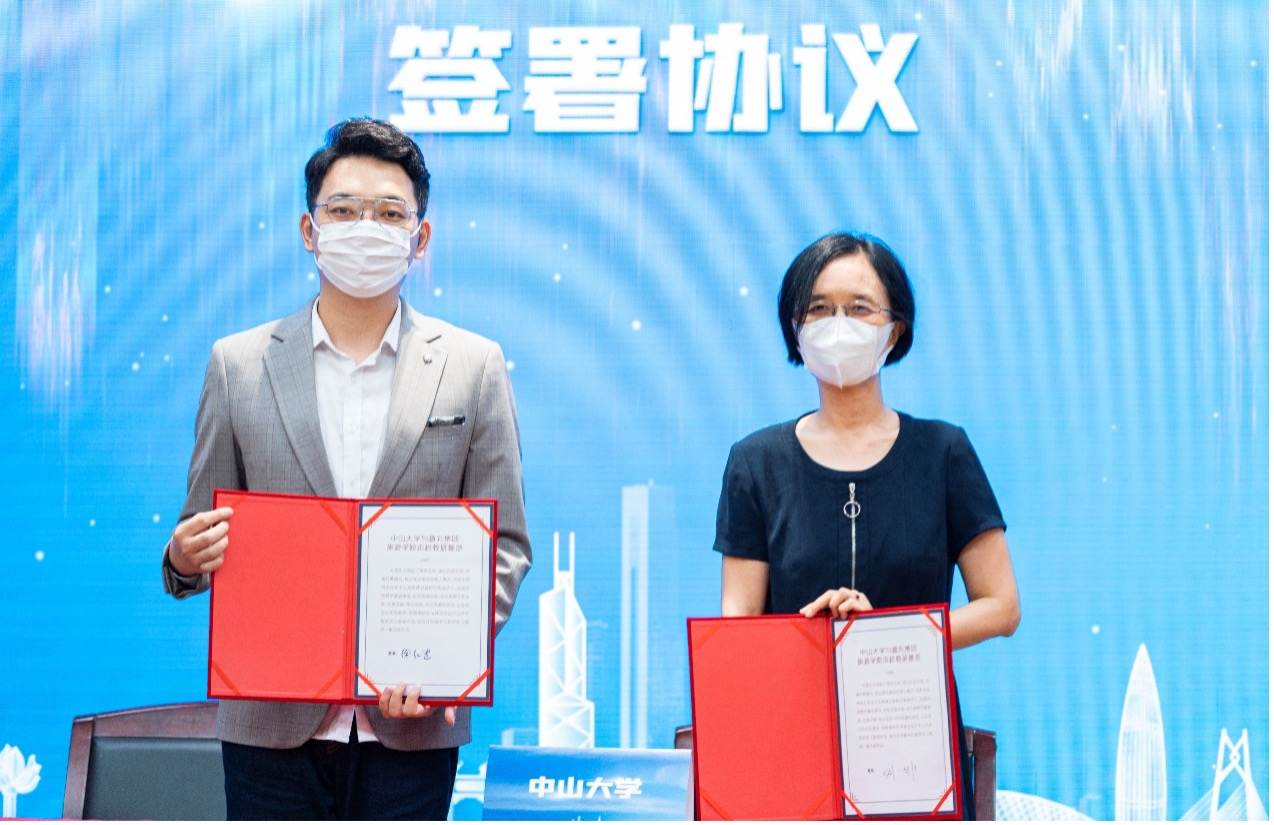 趣丸科技副总裁兼TT电竞CEO刘一非(左)与中山大学旅游学院院长徐红罡(右)共同启动《合作建设本科实习教学基地》