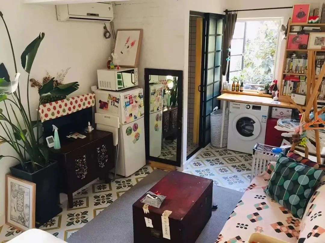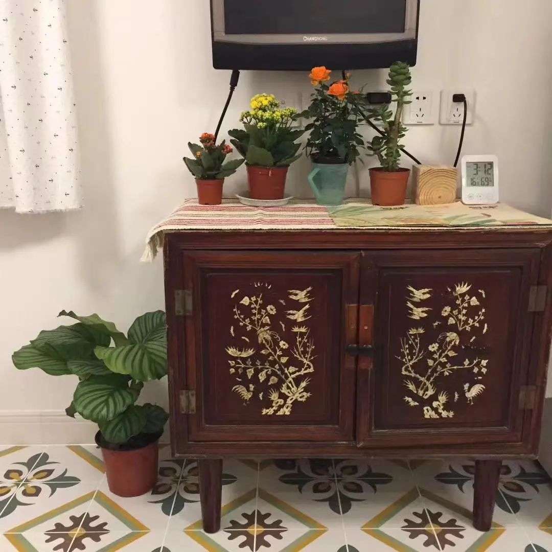 房间的设计理念并非为民宿而生,完全出于我想让自己住得舒服。这里原来是间毛坯房,我对厦门的花砖情有独钟,但老式的釉面一体砖已经停产多年,后来终于在厦门一家厂子淘到仿制花砖,一共326块被整齐贴在法租界15平米的地面上。房子里的橱柜茶几椅子是路边捡来的,上海人爱把没用的大件家具丢在路边等第二天环卫工收走,趁着晚上出门遛狗没准有意外收获。