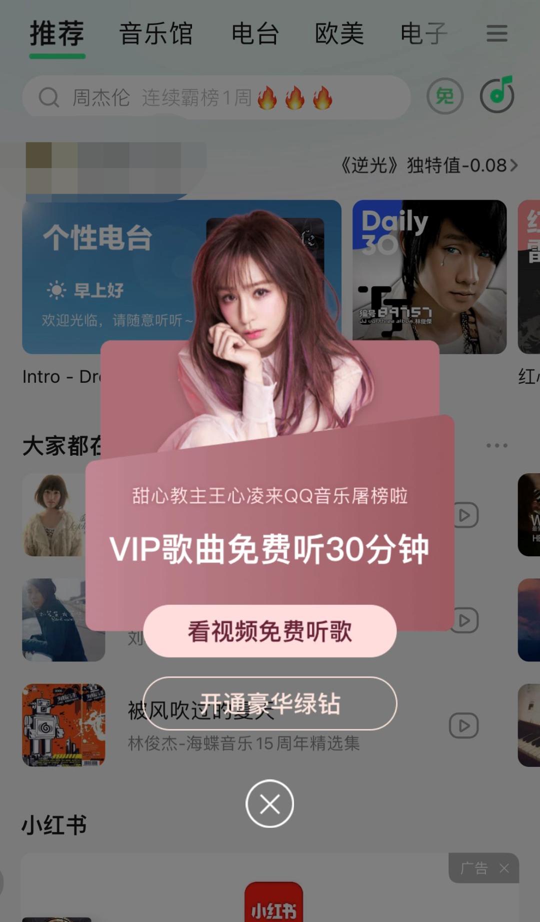 免费用户也有了每天做“VIP”的机会。在QQ音乐最新的内测版本中,免费用户会收到“看视频免费听歌”的弹窗提示,顺着提示点进去收看完一支30秒+10秒广告后,用户将获得30分钟免费收听VIP歌曲的机会。一位非会员用户告诉毒眸,一天至少能免费听1小时10分钟以上。