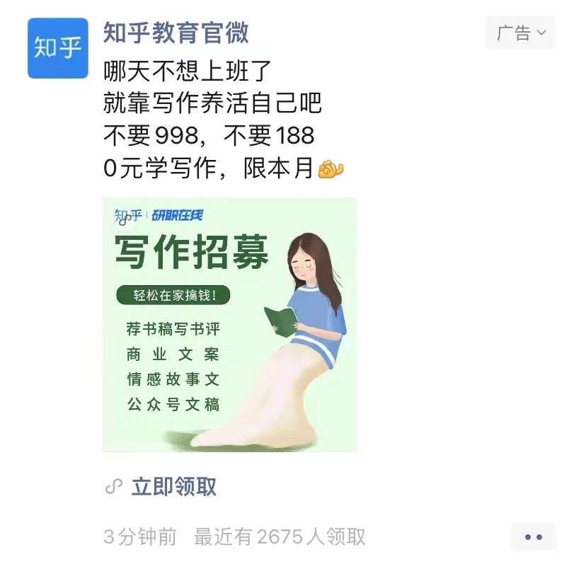 知乎目前大力推广的职业教育课程体系中,爆款写作变现类课程在信息流广告出现的比例不小。从商业化路径上看,这对知乎的内容商业化业务和付费会员业务都有助益。而门槛较低、相对平价的写作类课程,也有利于在职业教育业务发展的初始阶段提升用户付费意愿。