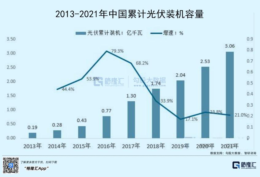 2013年,中国光伏累计装机量为0.19亿千瓦,到2021年已经飙升至3.06亿千瓦(306GW),年复合增速高达41.5%。有券商根据2025年非石化能源消耗占比20%的目标,以及非水电力消纳权重12.7%来推测,中国2025年光伏装机量将达到562GW,相当于22-25年年复合增速也有16.4%。