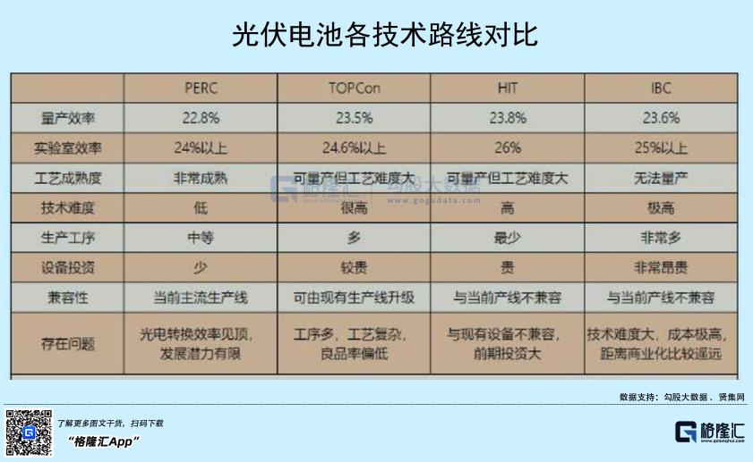 钙钛矿因有更高的光电转换效率以及更低的组件成本等优势,被业内认为可能有很强商业化前景的新一代光伏技术。据信达证券,钙钛矿单层电池理论效率可以达到31%,双节叠层可以达到35%,三节层更是可以达到45%。而现在主流的PERC转化效率理论极限为24.5%(目前已达23%)。另外,市场认为有可能成为下一代主流的TOPcon电池理论极限为28.7%,异质结(HJT)电池为27.5%。