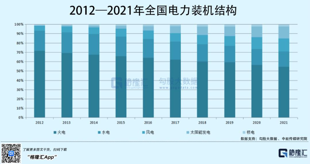 过去5年(2016-2021年),中国社会用电总量还保持着7.03%的年复合增长。这是火电、水电、风电、光伏、核电等更为上层的总蛋糕。未来数年,电力总蛋糕依旧会保持与GDP相差不大的增速增长。