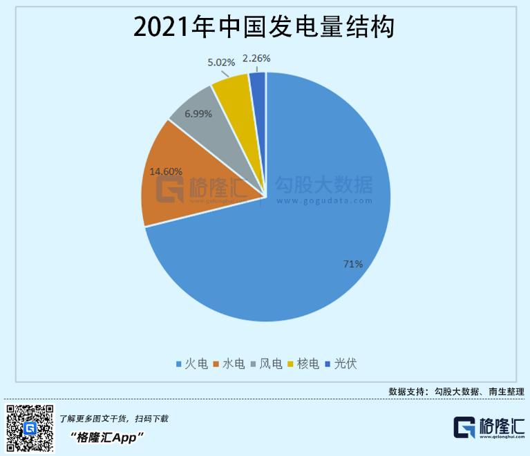 2021年发电结构中,火力、水力、风力、核能、光伏占发电总量的71%、14.6%、6.99%、5.02%、2.26%。