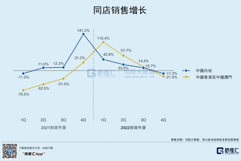 虽然周大福门店数量增加了很多,但同店销售业绩的下滑也值得关注。2022财年,周大福珠宝的内地直营零售点销售增长呈下滑趋势。