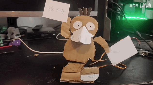 虽然硬纸板做的可达鸭外形有点抽象,但令人佩服的是,这只可达鸭可以像原版玩具一样动。
