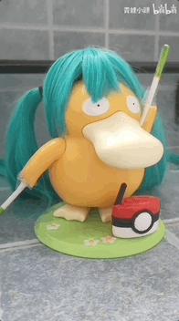 UP主@青蛙小顾给可达鸭做了一顶初音未来同款假发,同时把两根假葱粘在了玩具手上。